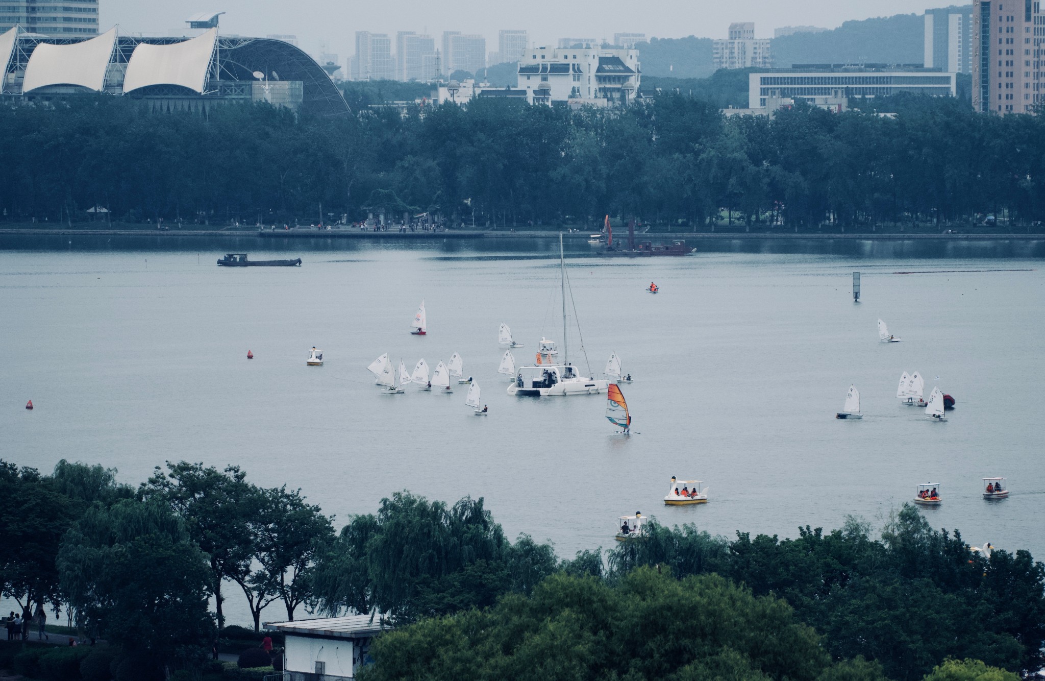 遙望遠方的湖面可見風帆的訓練活動,古城牆上與現代風浪板形成一個鮮明對比的畫面。
