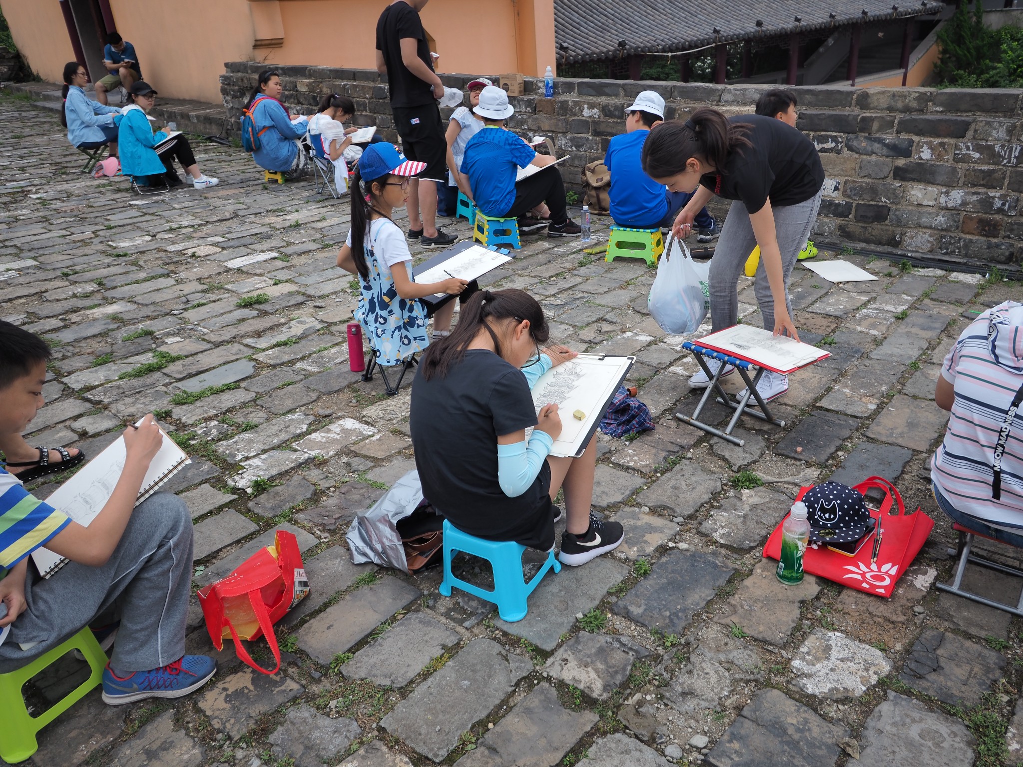 可能因為自己的孩子學畫,看到一群孩子在城牆上寫生,覺得畫面甚是可愛動人。
